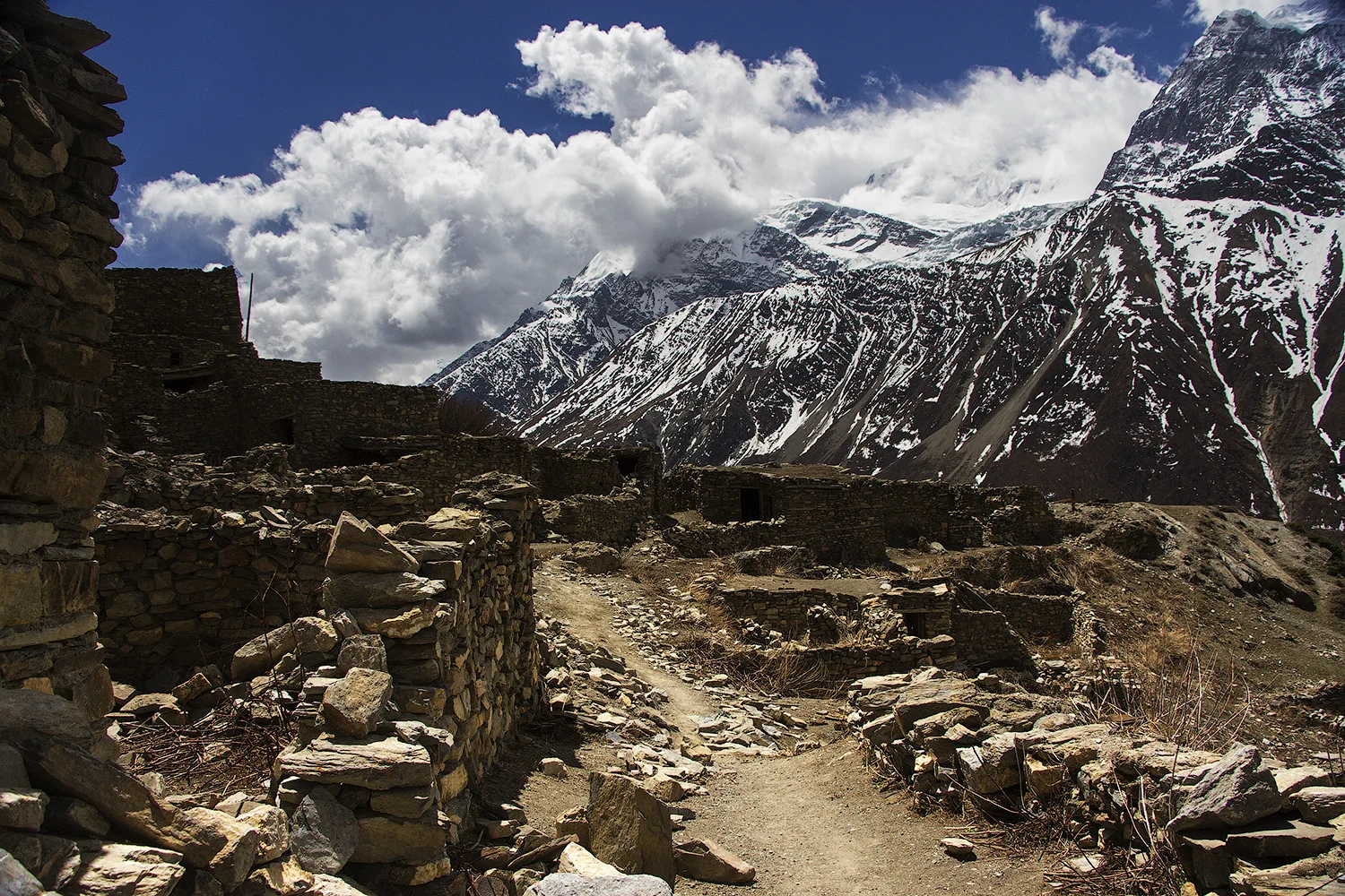 Для того, чтобы попасть к Тиличо, нужно было сойти с кольцевого маршрута и потом вернуться на него. Мы шли обратно не совсем тем путём, сэкономив на вилке пару километров и подъём. Путь проходил через Upper Khangsar — верхний вариант деревни, в которой мы останавливались на пути к озеру. Верхний Кангсар встретил нас депрессивным безразличием пустых оконниц и дверных проёмов. От деревни остались только каменные стены. Кое-где на петлях ещё висели тяжёлые деревянные двери, запертые на щеколду, хотя внутри домов уже нечего было закрывать. На холмике камней с молитвами (ещё один способ механического считывания) уже выросла и высохла трава, и камни стали казаться ещё старше, чем они есть.